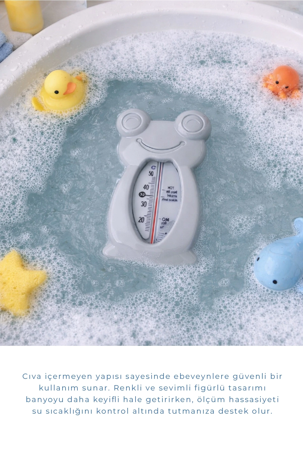 Bebeklerinizin banyo suyunun sıcaklığını ölçer ve kontrol eder.