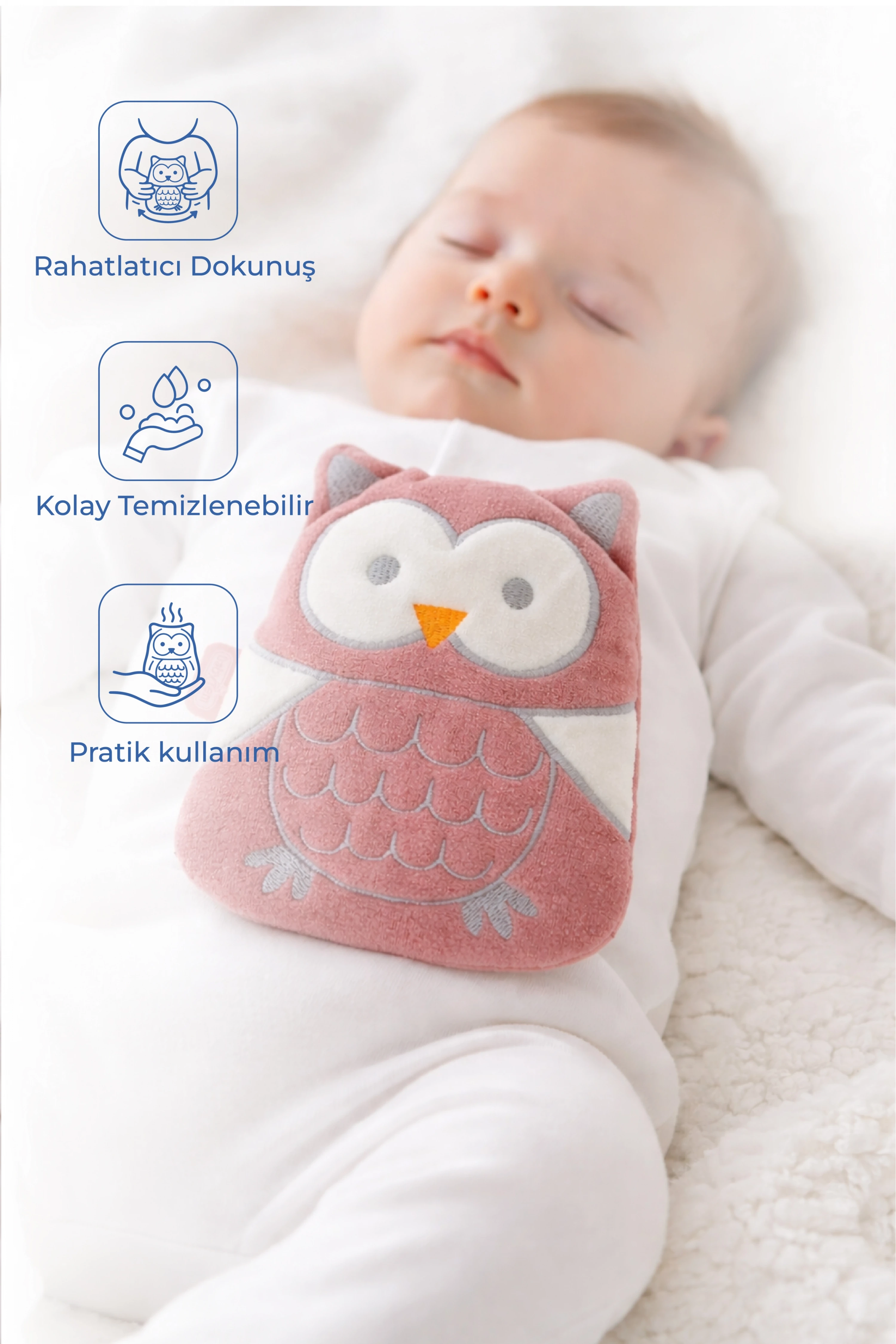 Buzlukta soğutularak ise ateş, diş çıkarma döneminde oluşan şişlikler ve küçük çarpmalar için rahatlama sağlar. Bebek Dostu Tasarım: Yumuşak, kadife kılıfı ile bebeğinizin hassas cildine uyumludur. Çok Amaçlı Kullanım: Yalnızca bebekler için değil, anneler için de doğal bir terapi yastığıdır.