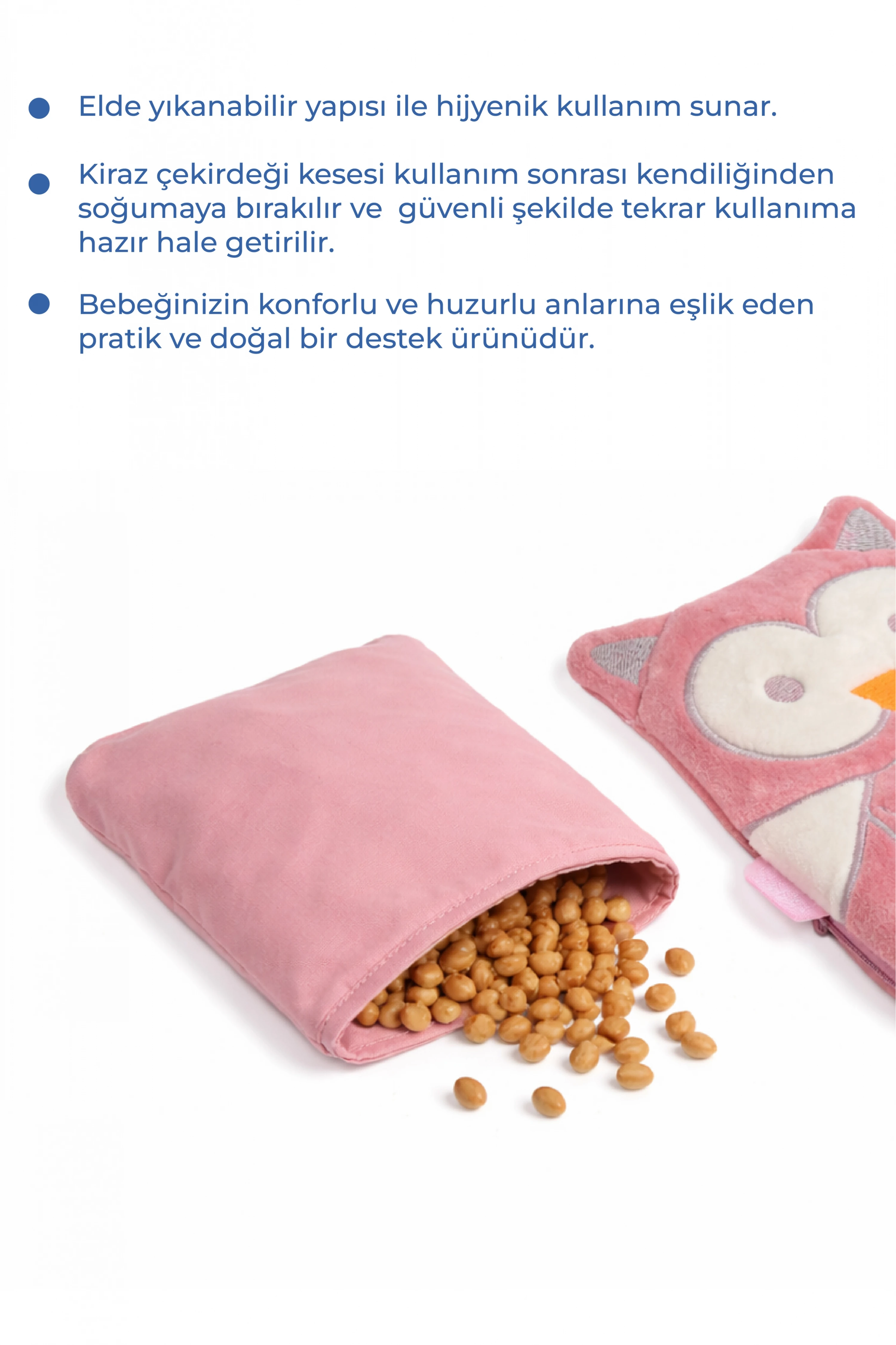 Isıyı uzun süre muhafaza edebilen kiraz çekirdeği, ısıyı yavaş yavaş dağıtarak bebeğinizin gaz sancısının giderilmesine yardımcı olur.