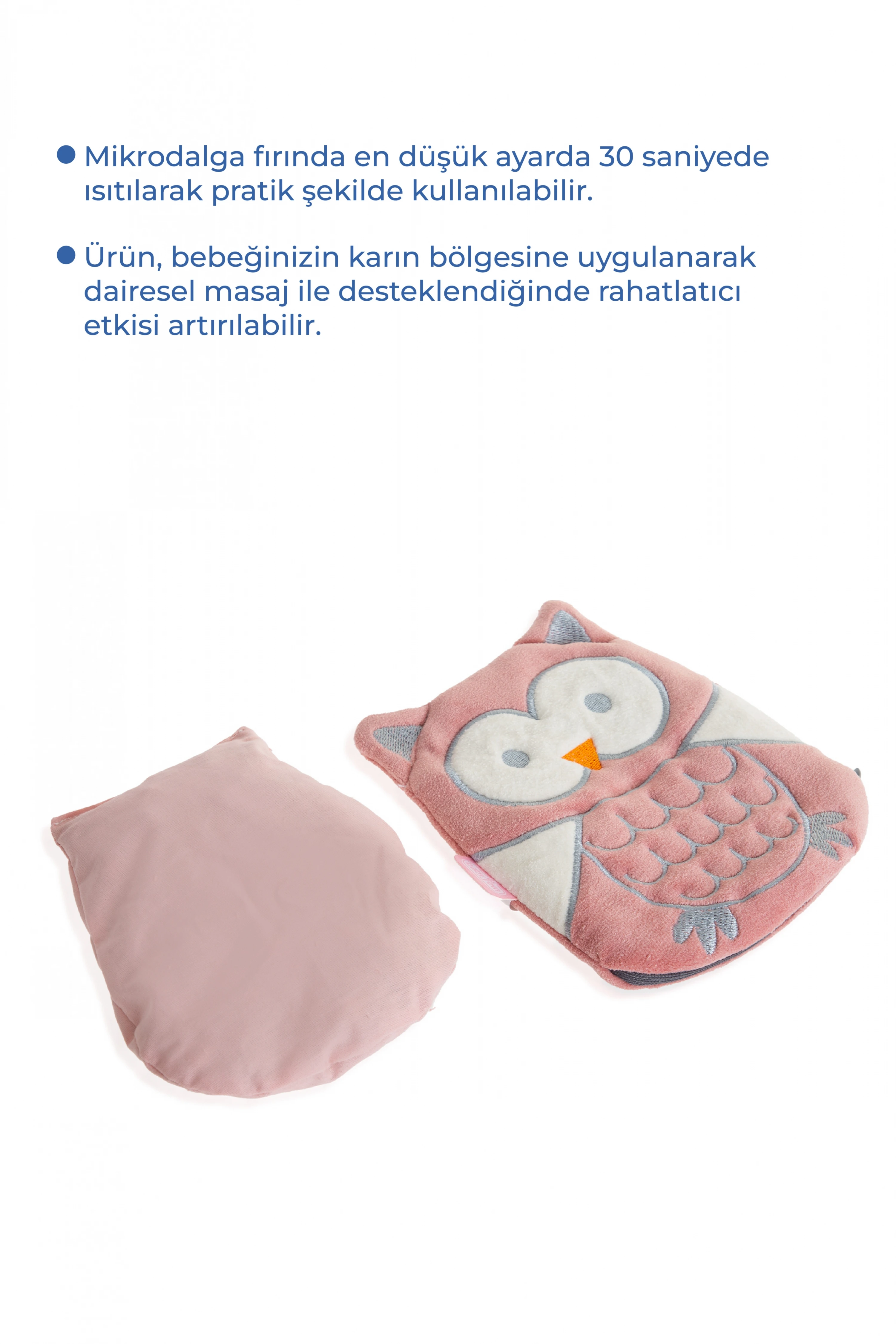En iyi sonuç için bebeğinizin ısınmış karnına dairesel hareketlerle masaj yapın. %100 doğal kiraz çekirdeğinden üretilmiştir. KULLANIMI: Kiraz çekirdekli keseyi ürünün içerisinden çıkartıp, mikrodalga veya fırınınızın en düşük ayarında 1 dakika ısıtınız. Isıtılmış kiraz çekirdekli keseyi cebe koyup bebeğin karnına gelecek şekilde bağlayın. Uzun süre ısıyı muhafaza edebilen kiraz çekirdeği, muhafaza ettiği ısıyı yavaş yavaş dağıtarak bebeğinizin gaz sancısının giderilmesine yardımcı olur. En iyi sonuç için bebeğinizin ısınmış karnına dairesel hareketlerle masaj yapın. %100 doğal kiraz çekirdeğinden üretilmiştir.