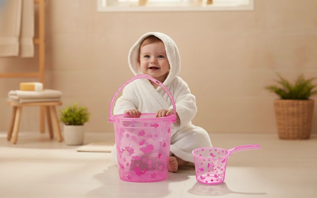 Babyjem 923 Şeffaf Kova & Maşrapa Set Pembe Desenli, bebek banyosu için şık ve kullanışlı bir set sunar.
