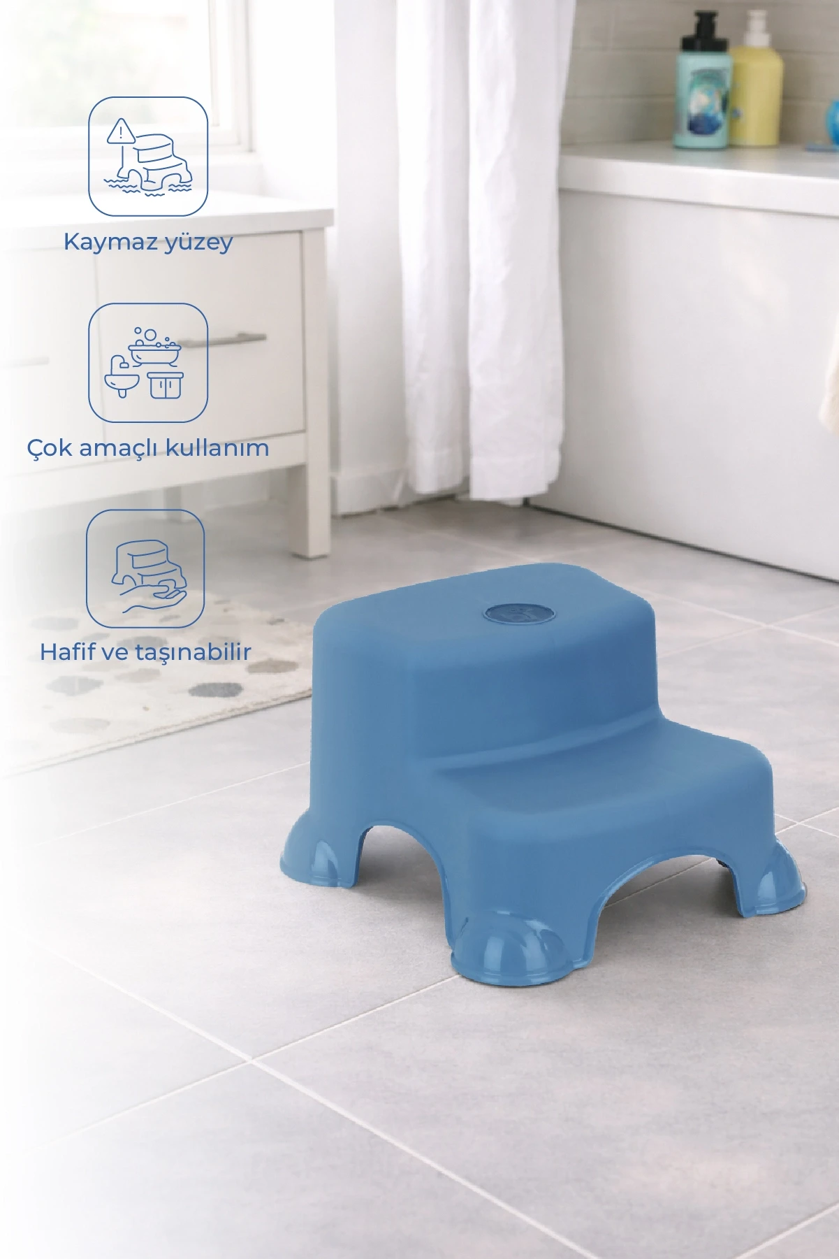 Babyjem Katlı Basamak İndigo Mavi, tuvalet eğitim sürecinde çocuklarınızın rahatlıkla kullanabileceği pratik bir üründür. Ürün, banyo ve tuvalet eğitimine geçiş döneminde çocukların klozete daha kolay erişebilmesini sağlar.