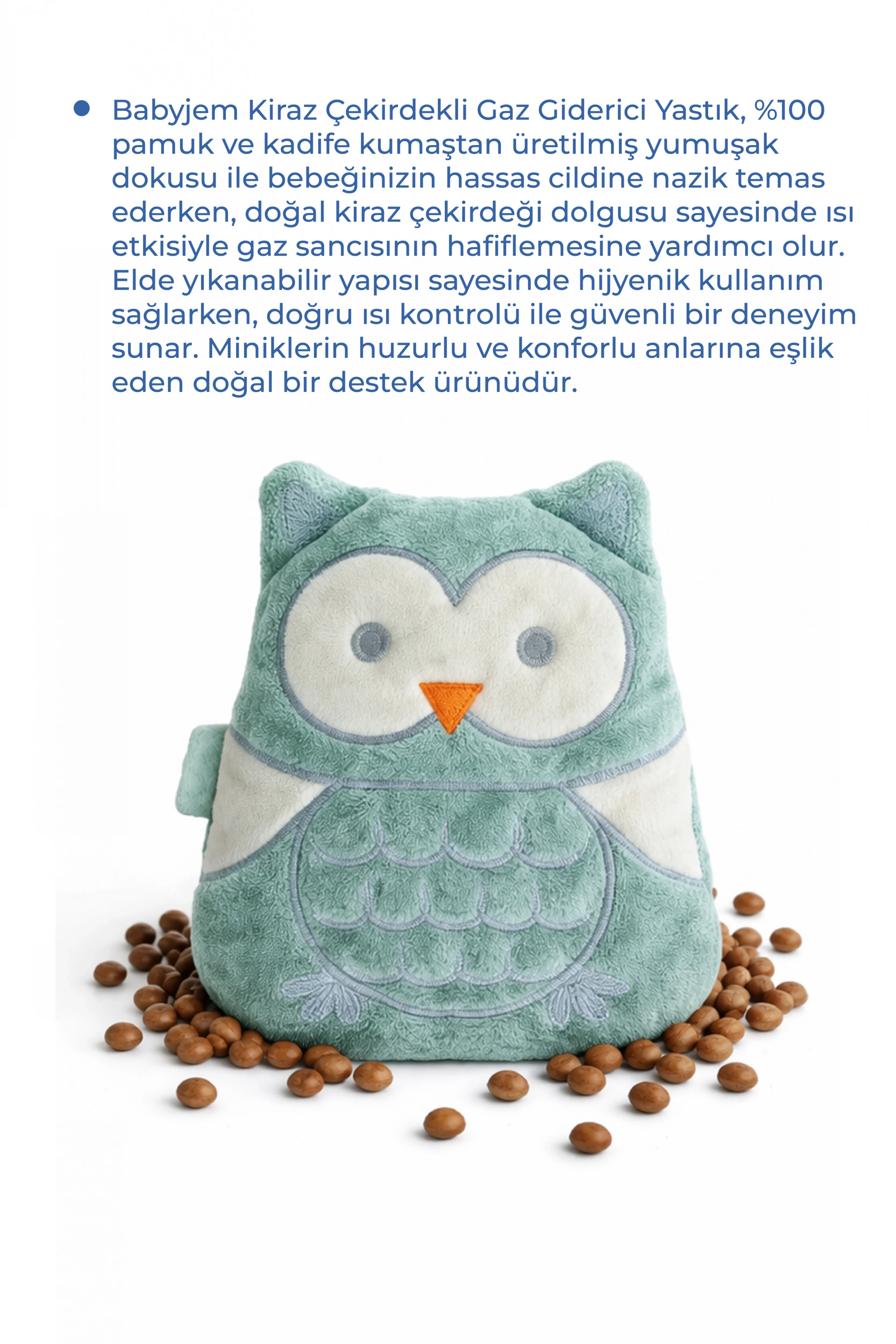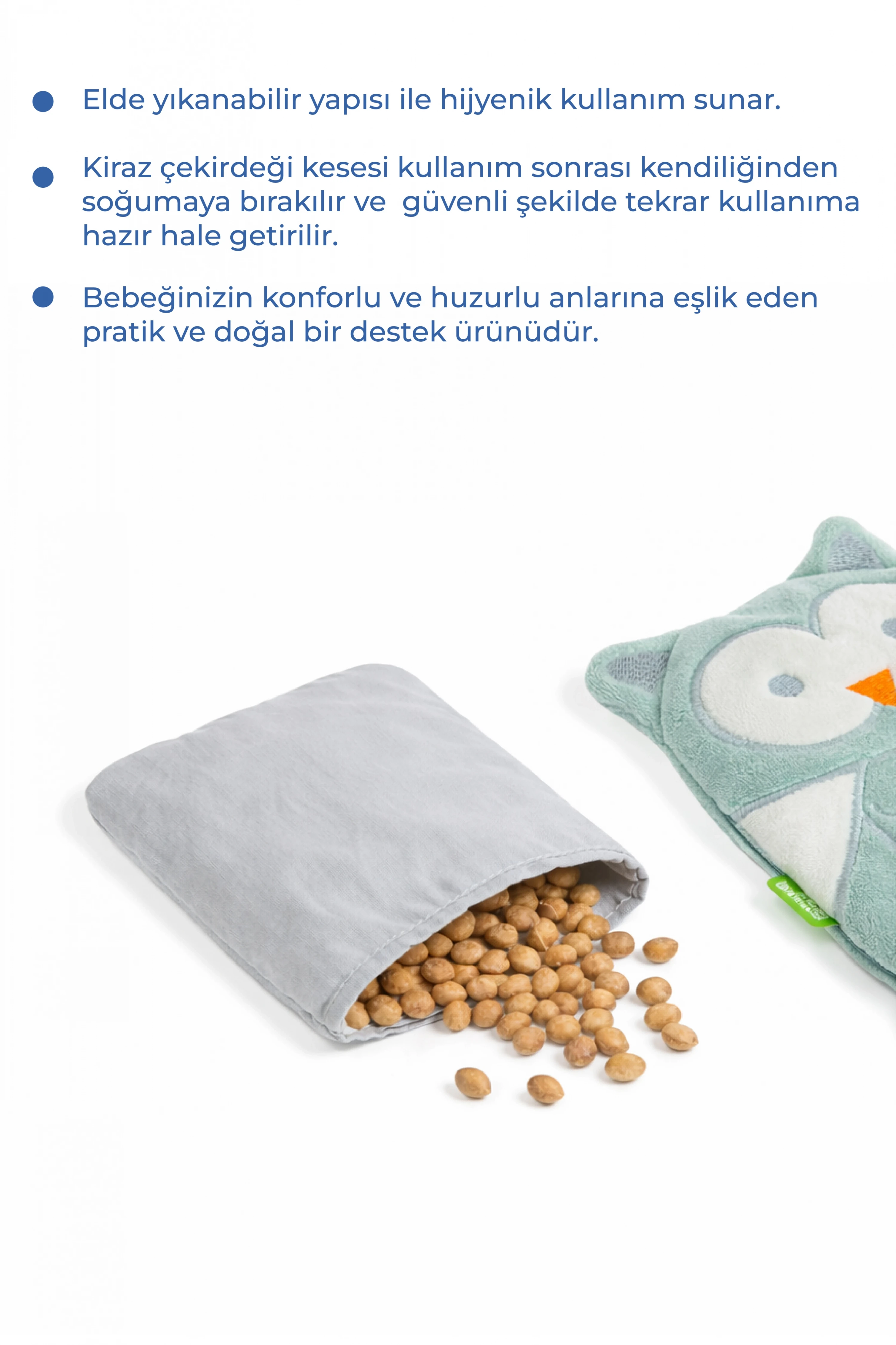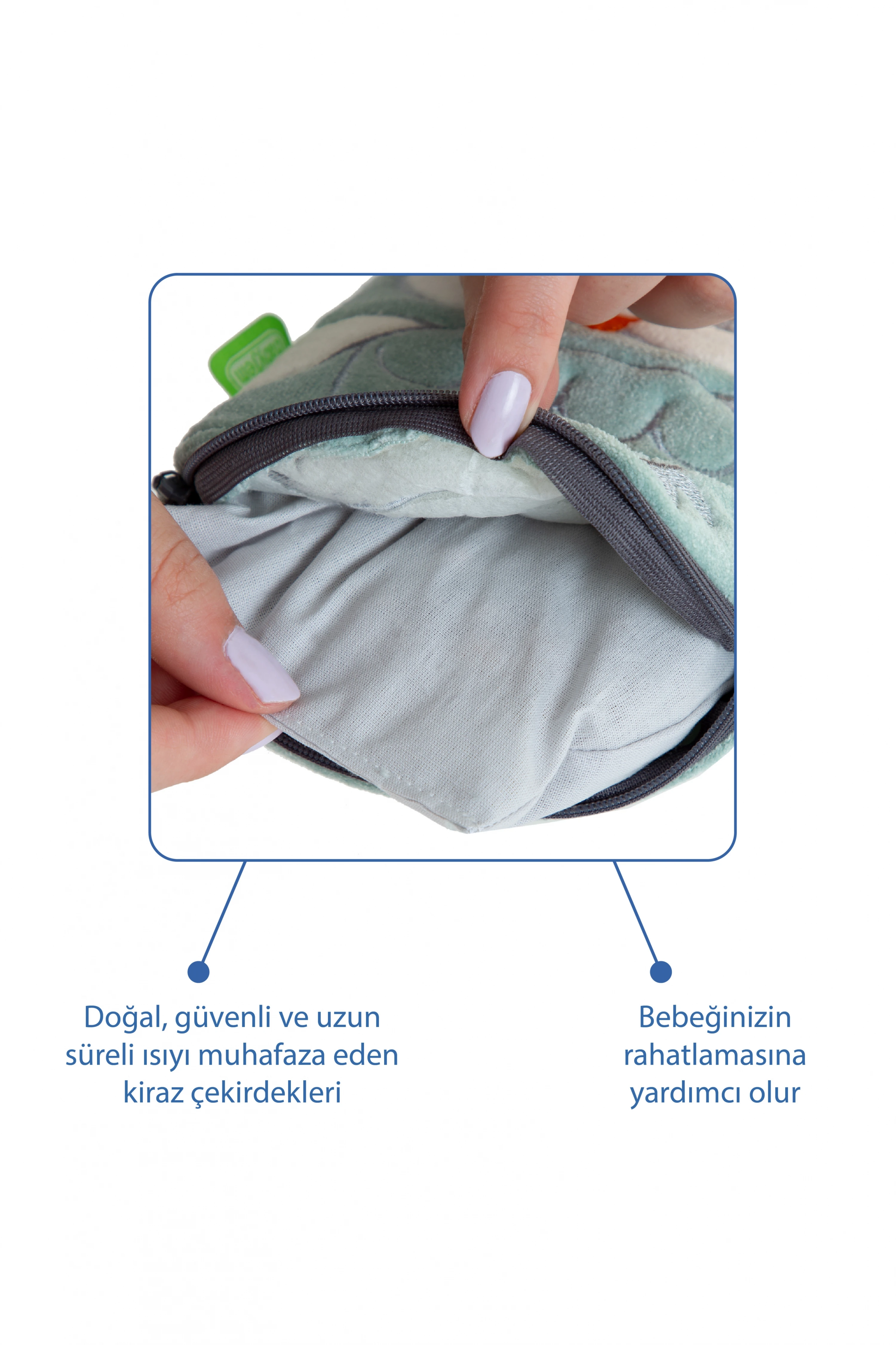 Kullanımı: Kiraz çekirdekli keseyi mikrodalga veya fırınınızın en düşük ayarında 1 dakika ısıtınız. Isıtılmış kiraz çekirdekli keseyi cebe koyup bebeğin karnına gelecek şekilde bağlayın. Isıyı uzun süre muhafaza edebilen kiraz çekirdeği, ısıyı yavaş yavaş dağıtarak bebeğinizin gaz sancısının giderilmesine yardımcı olur.
