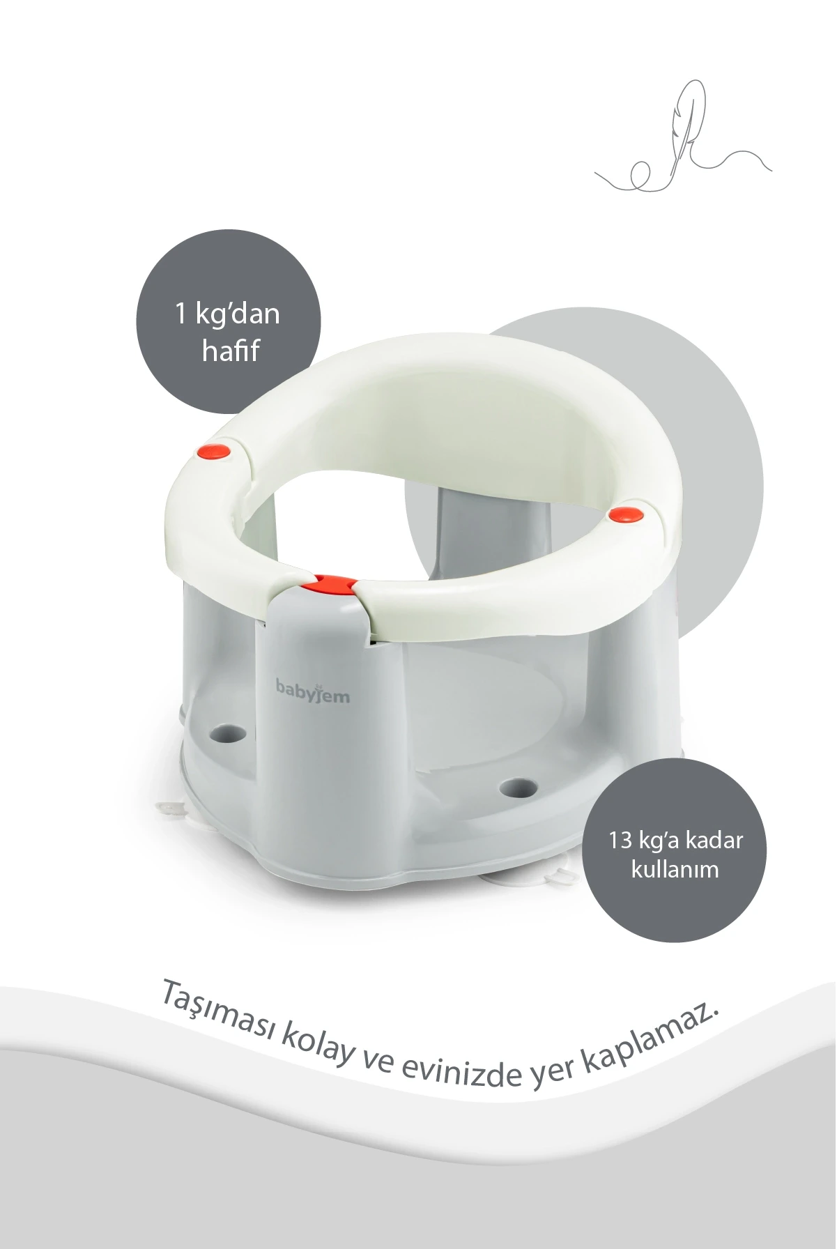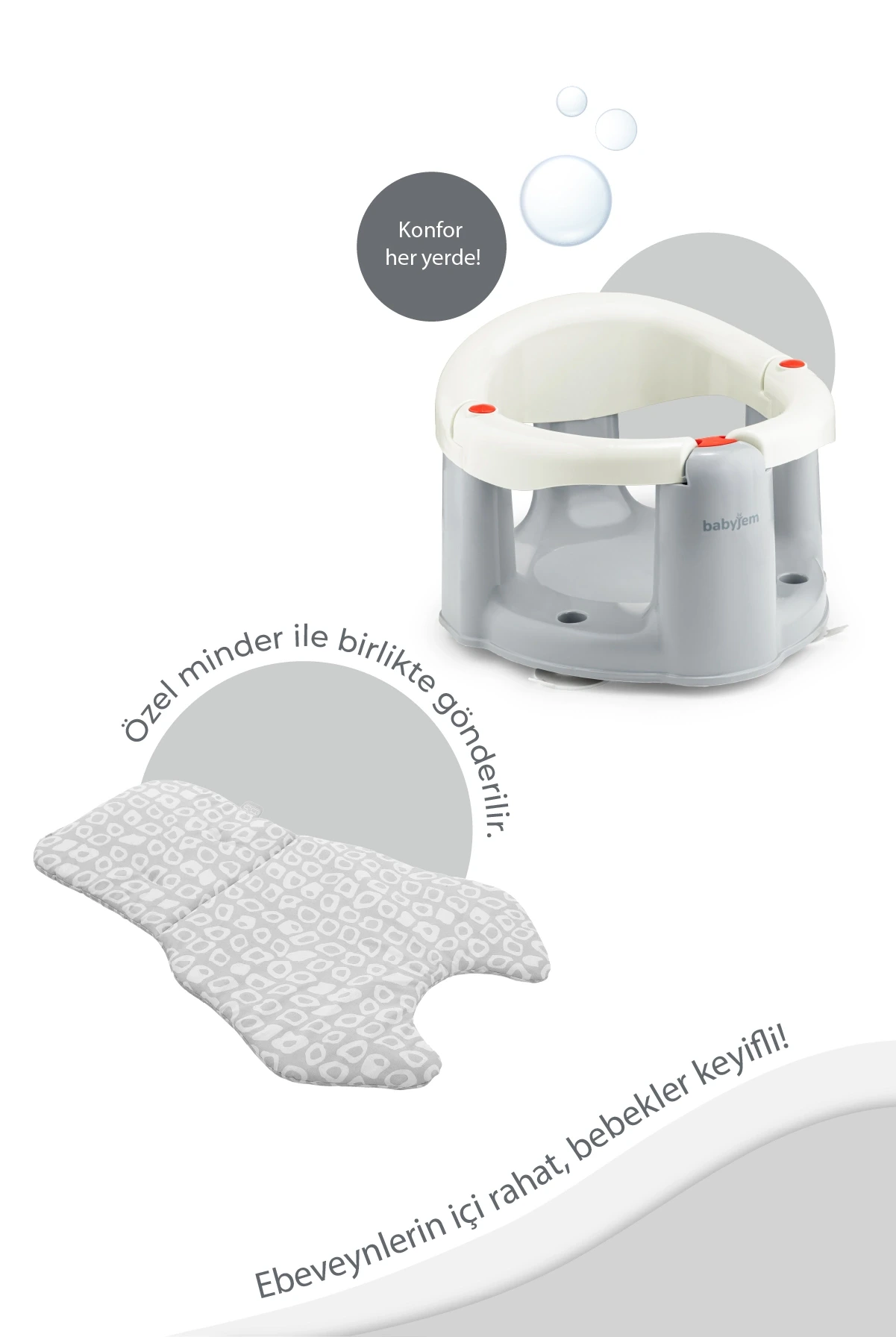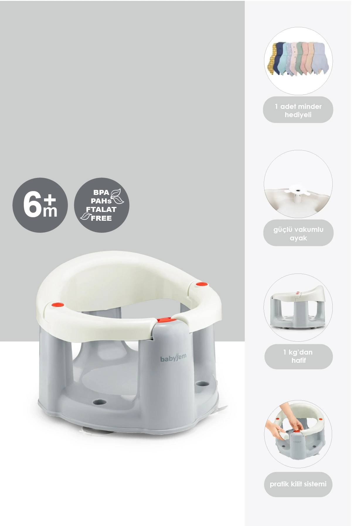 Babyjem Önden Açılır Banyo ve Mama Oturağı, bebeklerinizin banyo ve beslenme saatlerini daha konforlu hale getirmek için tasarlanmıştır. Bu şık ve kullanışlı ürün, bebeğinizin rahat bir şekilde oturmasını sağlayacak ve sizin de daha kolay bir şekilde banyo yaptırmanıza veya beslemesine yardımcı olacaktır.
