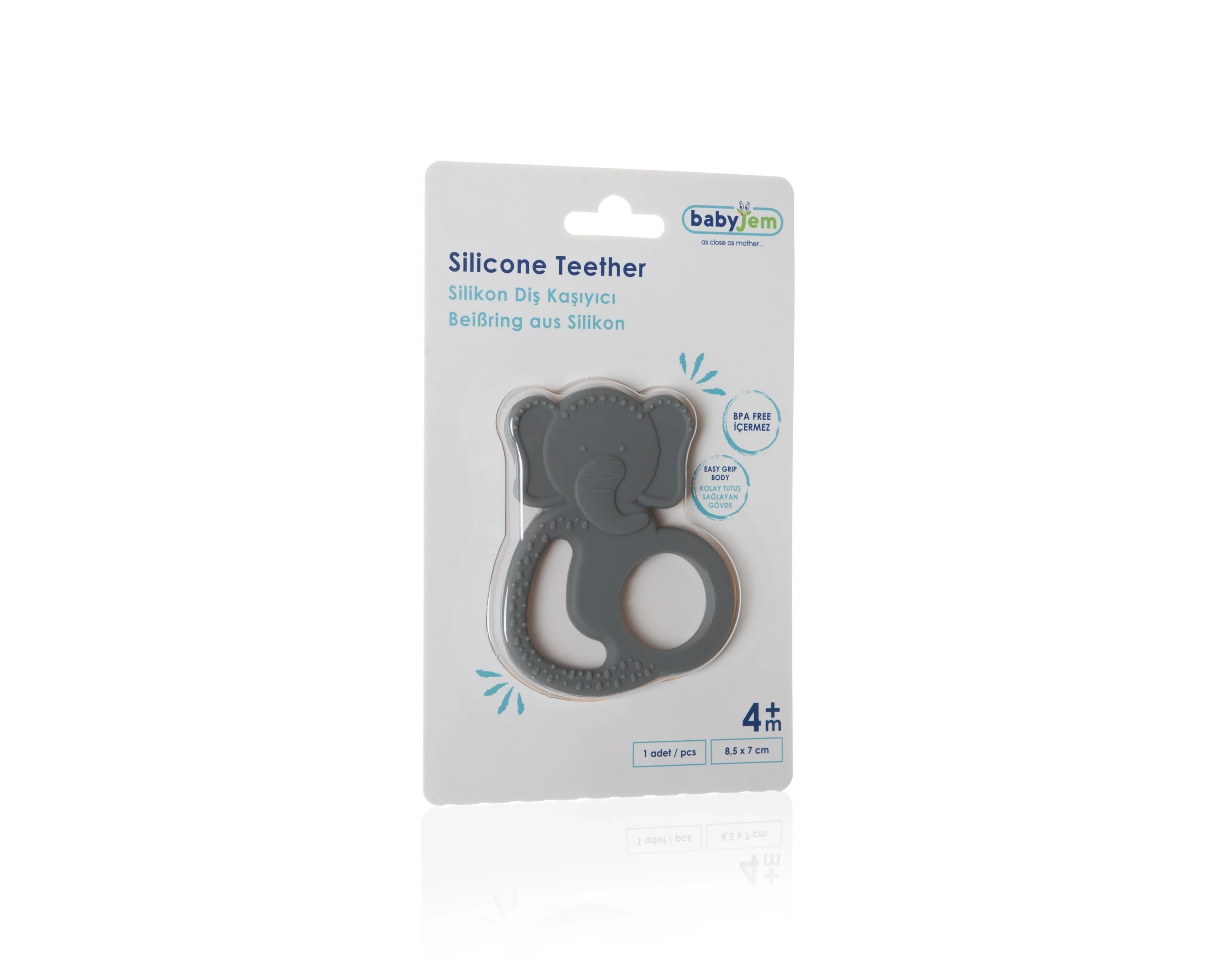 Babyjem Silikon Fil Diş Kaşıyıcı Gri, bebeklerin diş çıkarma sürecinde rahatlatıcı bir etkiye sahip olan şirin bir üründür.