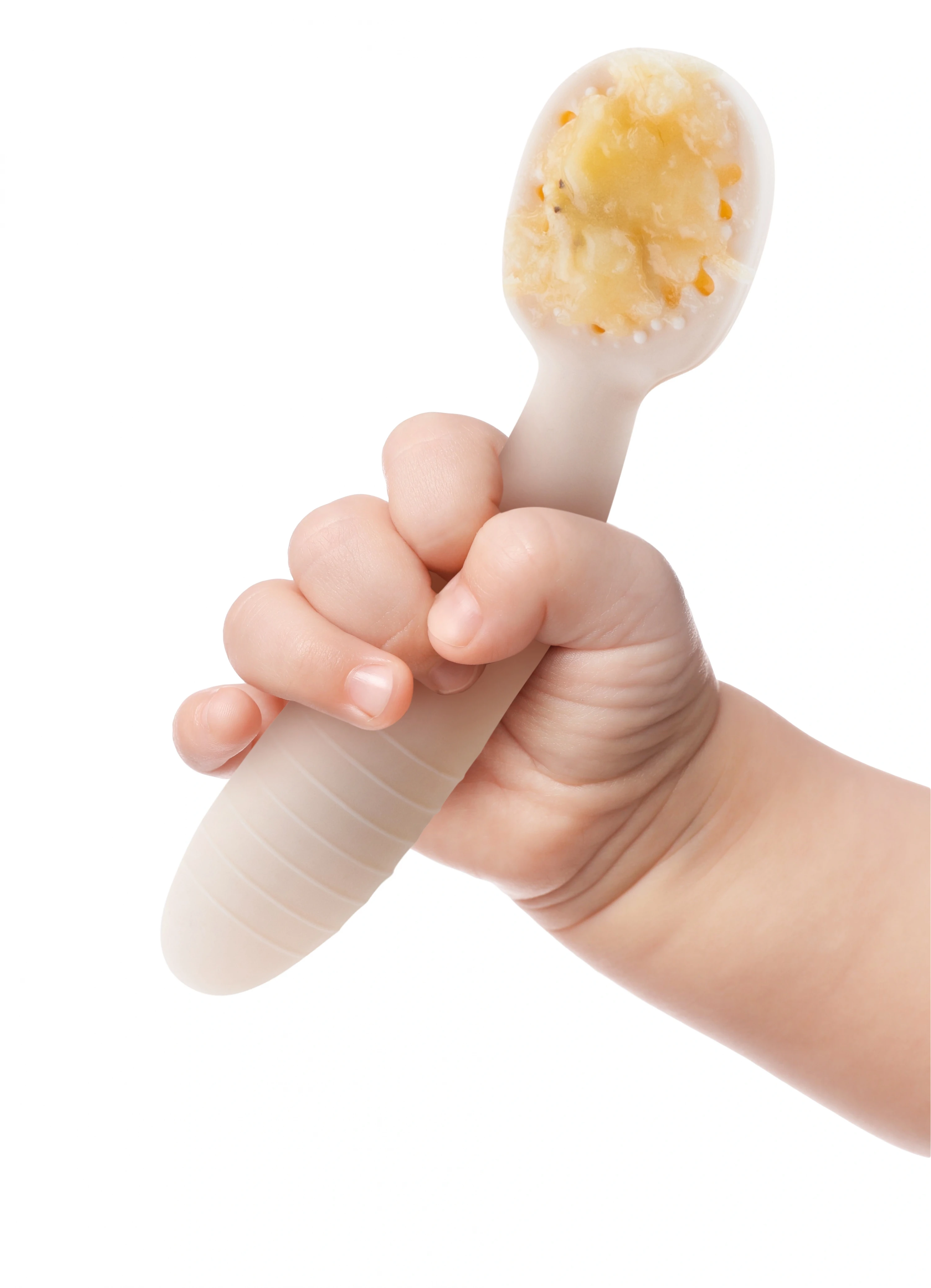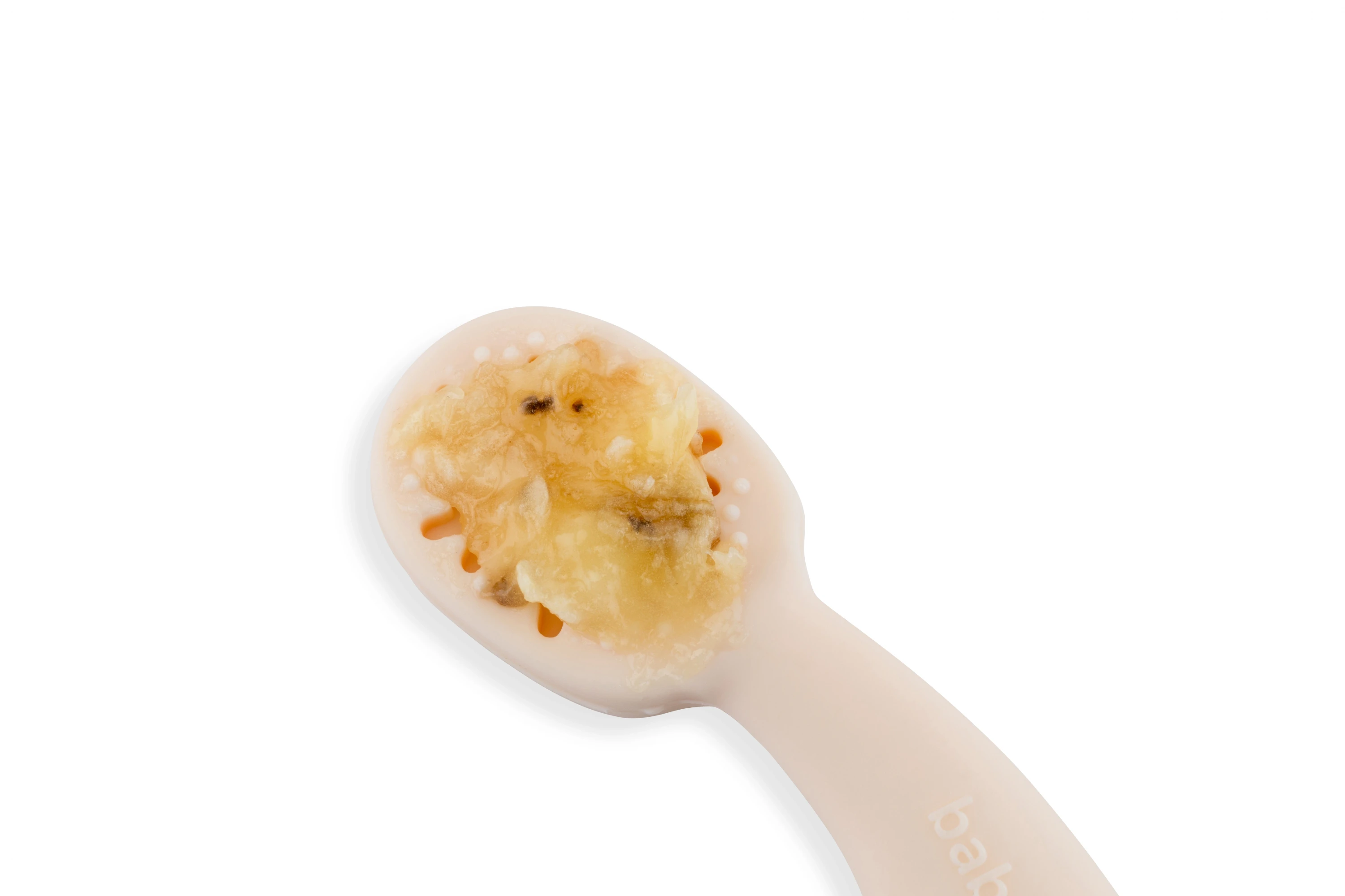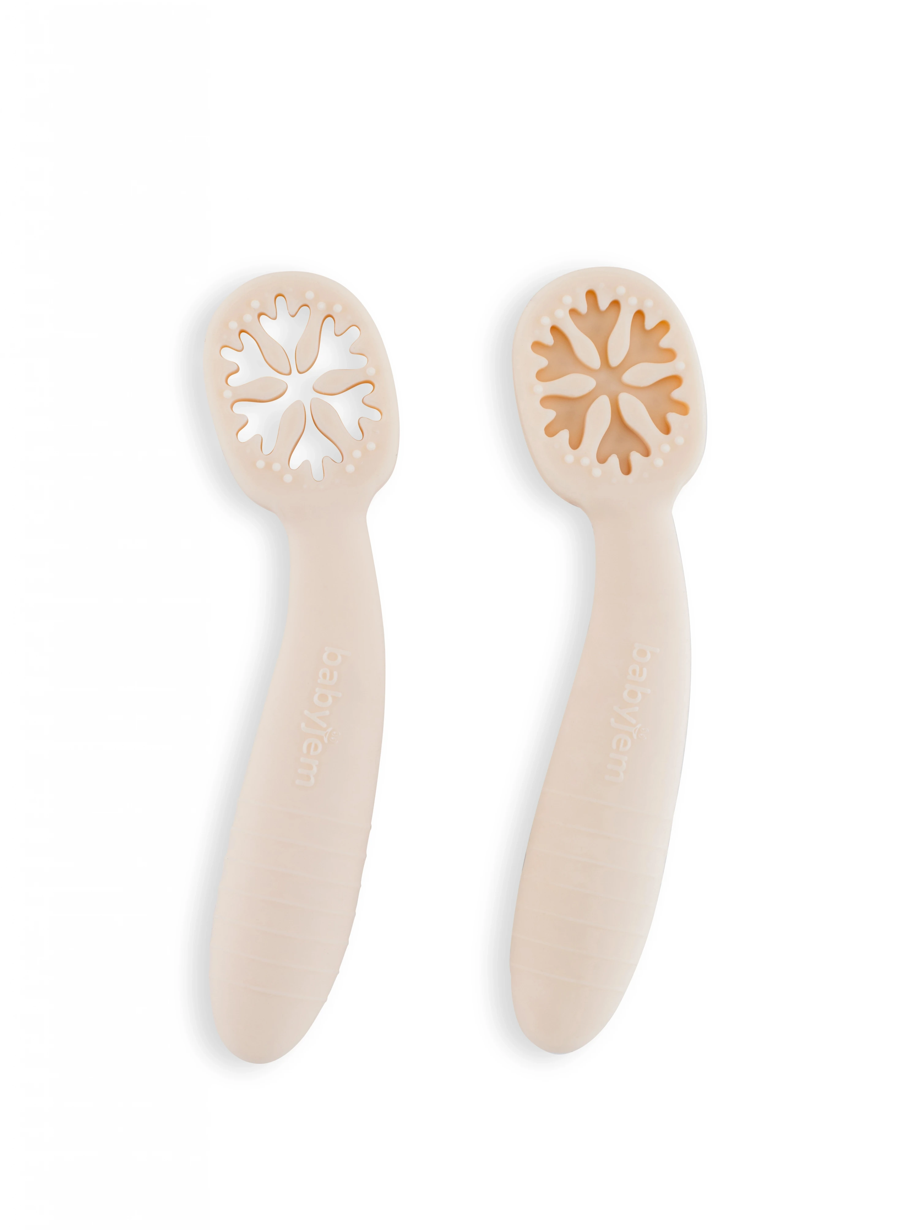 Babyjem Silikon İkili İlk Kaşığım Ekru, bebeğinizin kendi başına yemek yeme becerisini geliştirmesine yardımcı olur ve beslenme sürecini keyifli hale getirir.