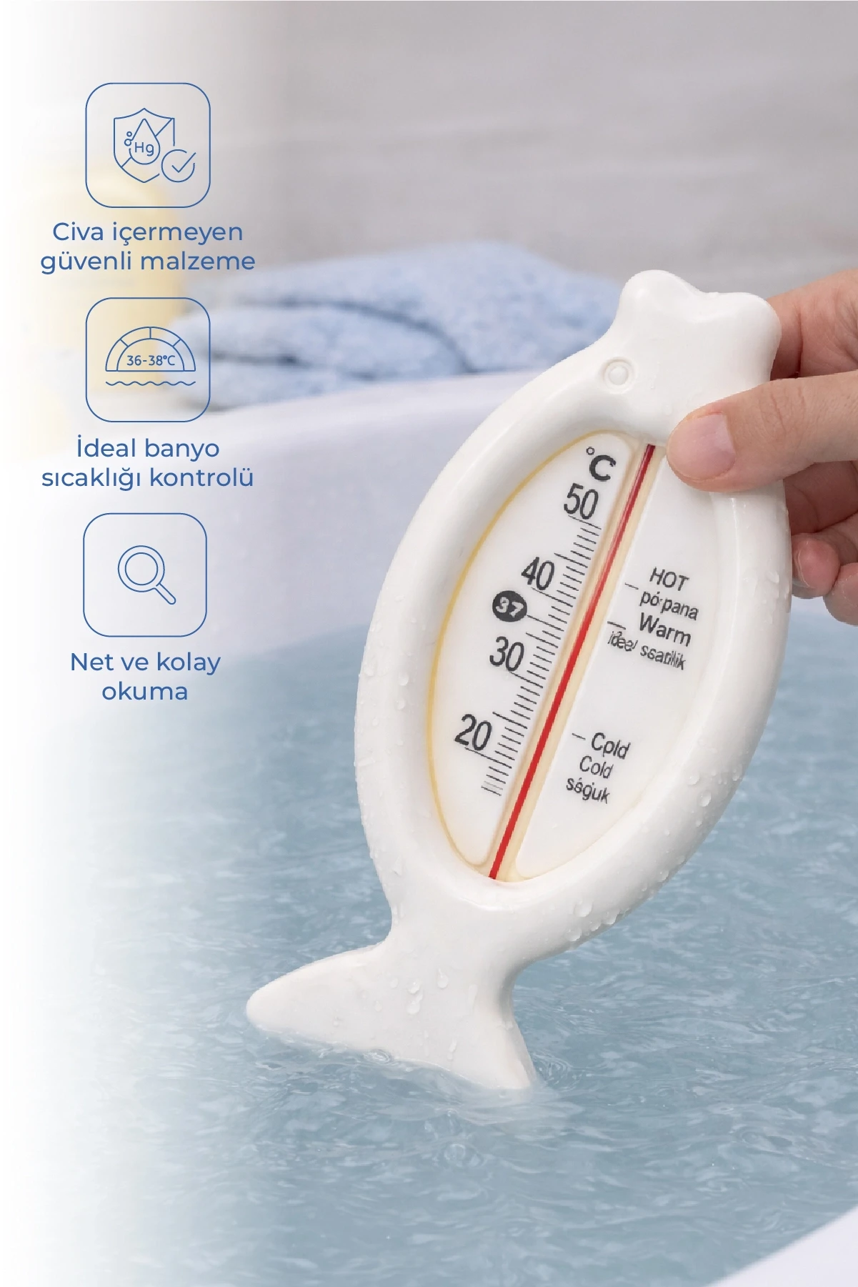 Babyjem Cıvasız Balık Banyo Oda Termometresi Beyaz, bebeklerin banyo keyfini güvenle yaşaması için tasarlanmıştır.