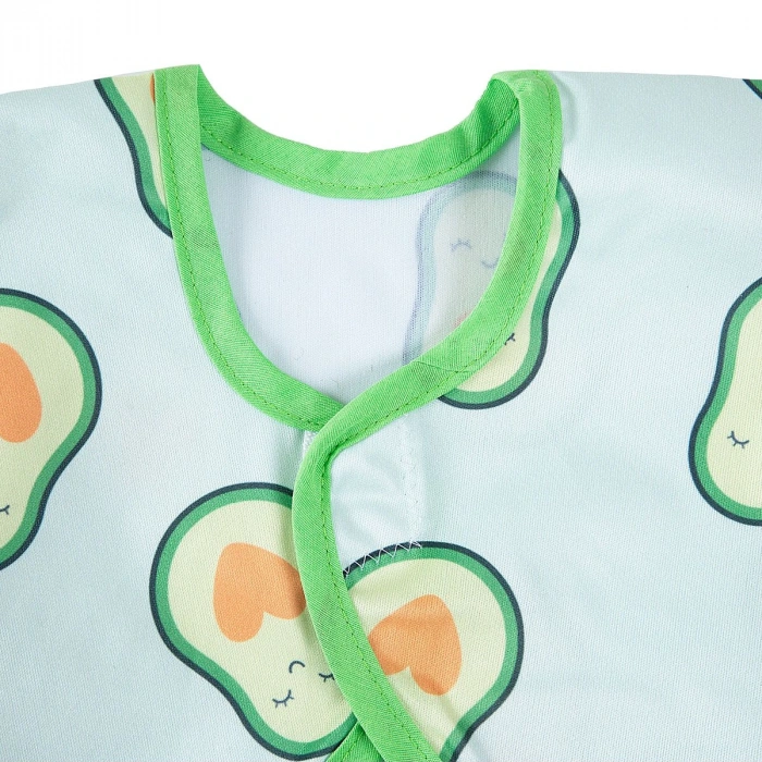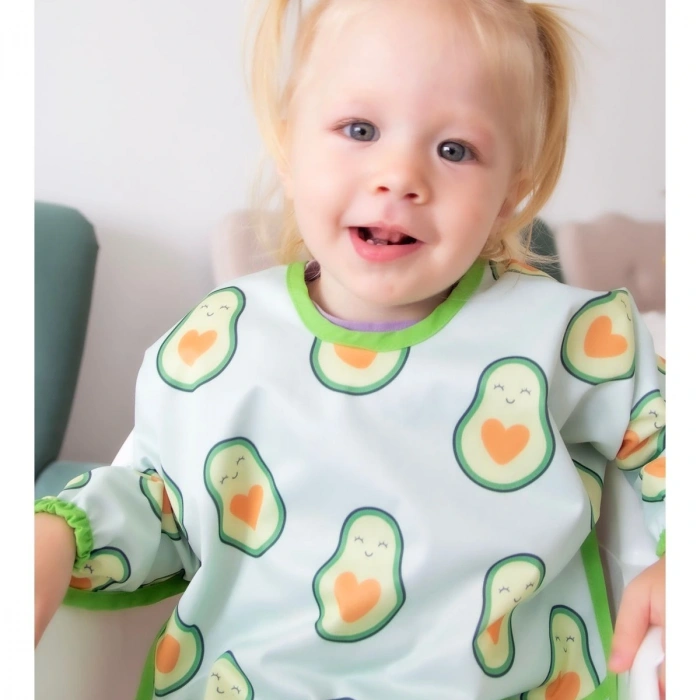 Standart beden ölçüsüyle her bebek için uygun bir kullanım sağlar ve kolayca giydirilip çıkarılabilir; Avokado deseniyle şık ve eğlenceli bir görünüm kazandırarak bebeğinizin yemek saatlerini daha keyifli hale getirir; Kollu tasarımı sayesinde bebeğinizin kollarını da korur ve yemek sırasında rahat hareket etmesine olanak tanır;