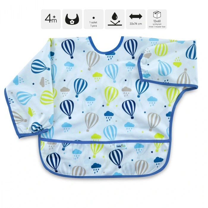 Standart beden ölçüsüyle her bebek için uygun bir kullanım sunar ve kolayca giydirilip çıkarılabilir; Kollu tasarımı sayesinde bebeğinizin kollarını sıcak tutarken, balon deseniyle şık bir görünüm sağlar; Mama önlüğü olarak tasarlanmış olup, bebeğinizin yemek sırasında dökülenleri kolayca temizlemeyi mümkün kılar;