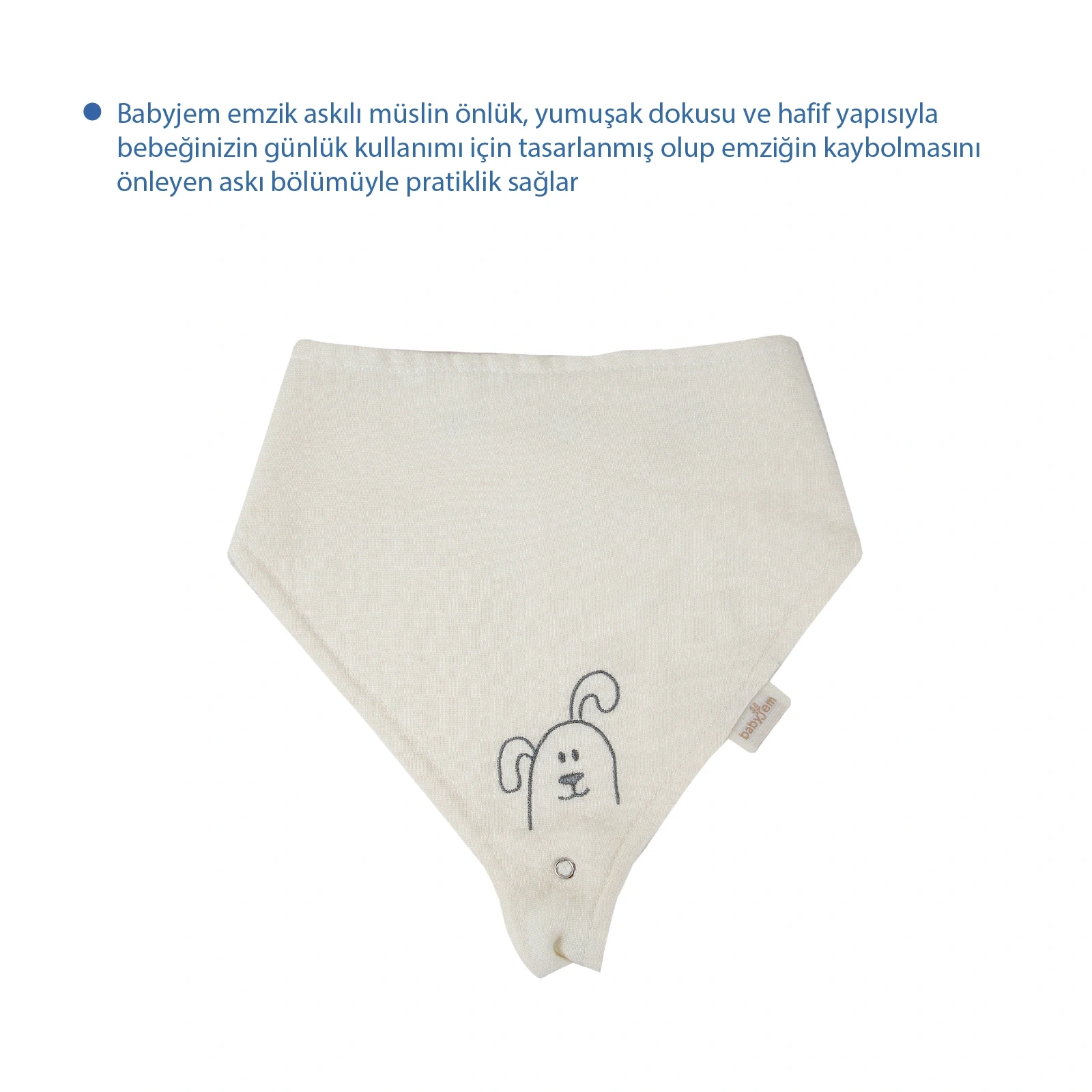 Babyjem Emzik Askılı Müslin Önlük Ekru, bebeğinizin beslenme zamanlarını daha keyifli ve hijyenik hale getirirken, onun tarzını da yansıtacak şık bir aksesuardır.