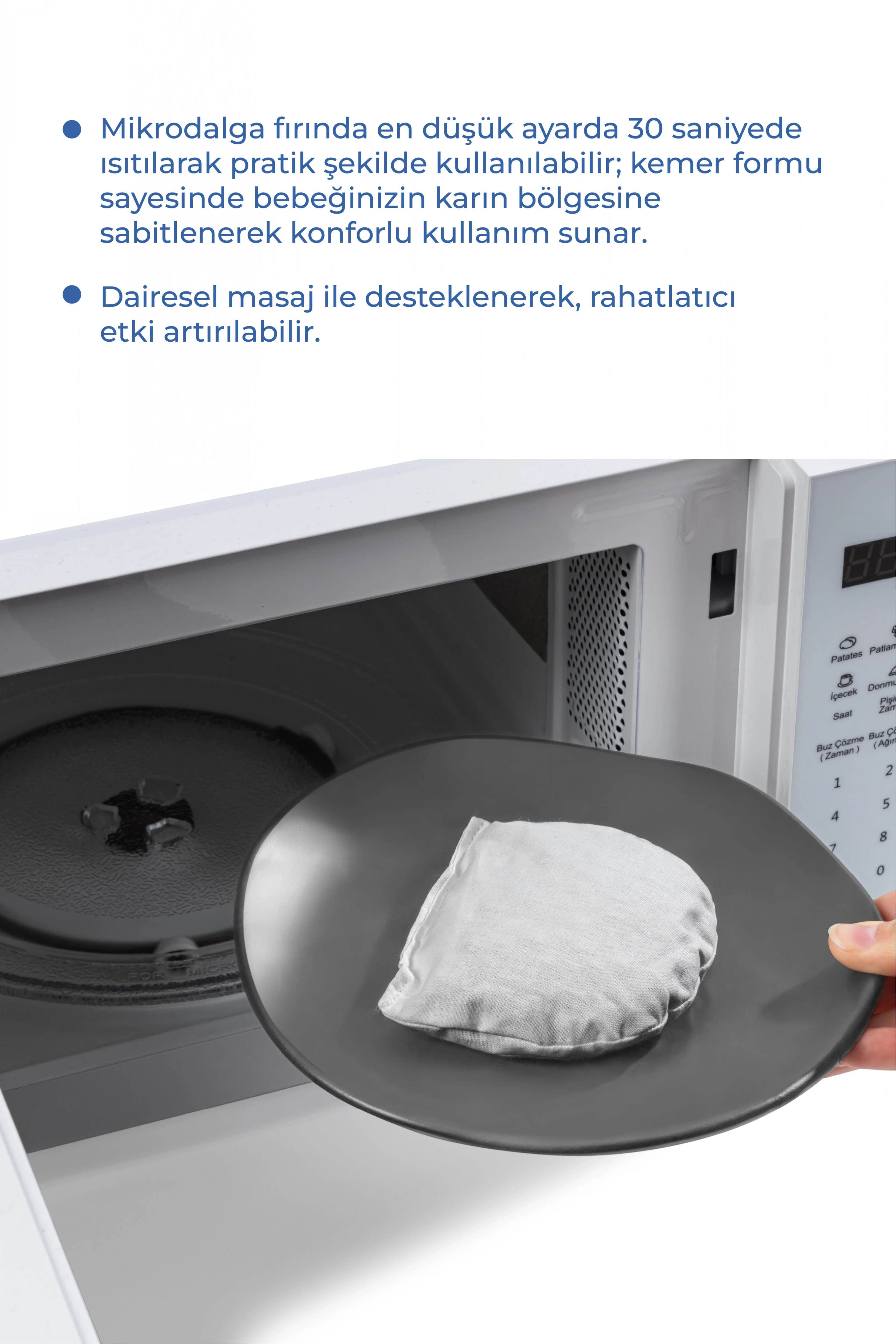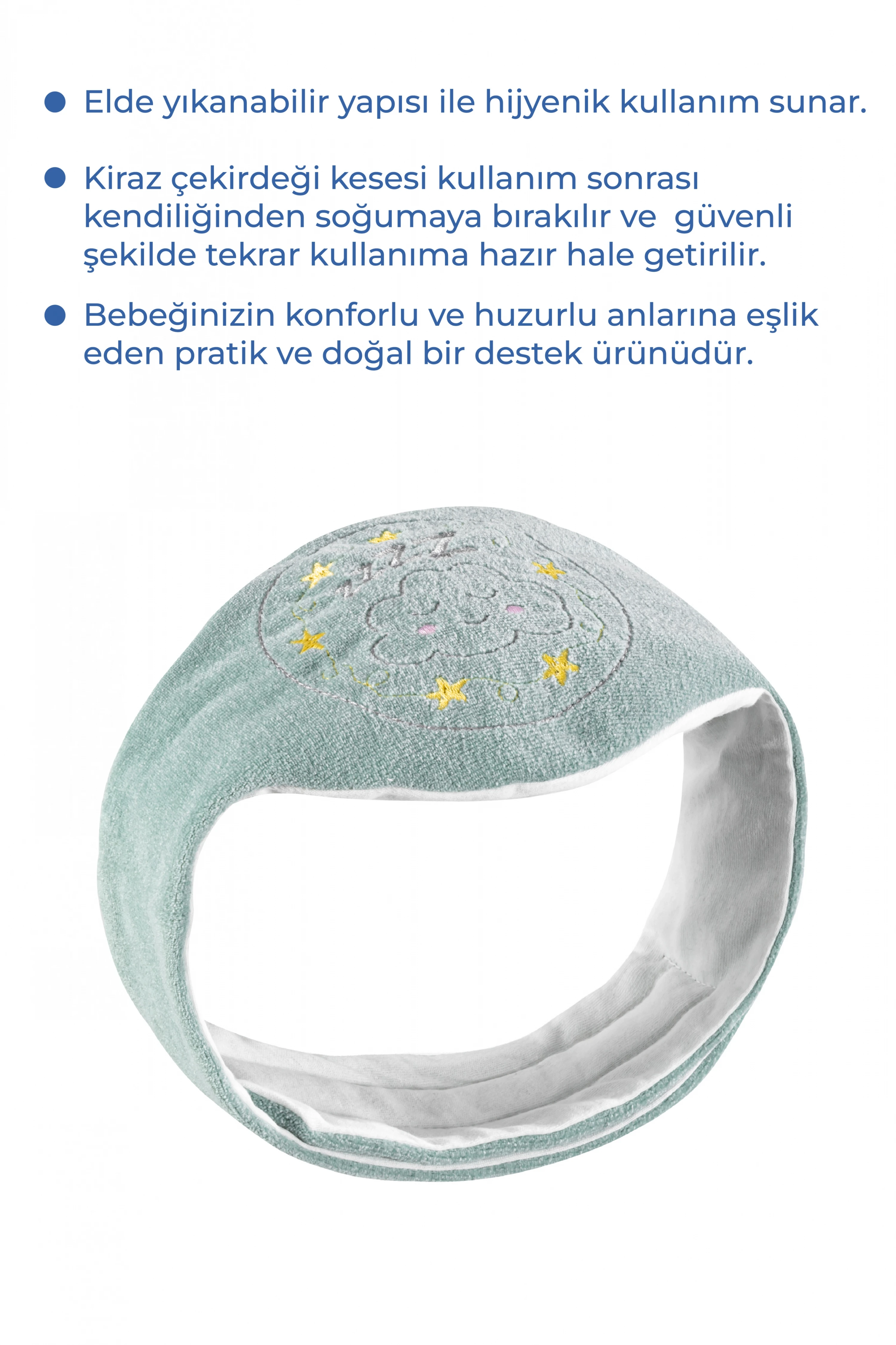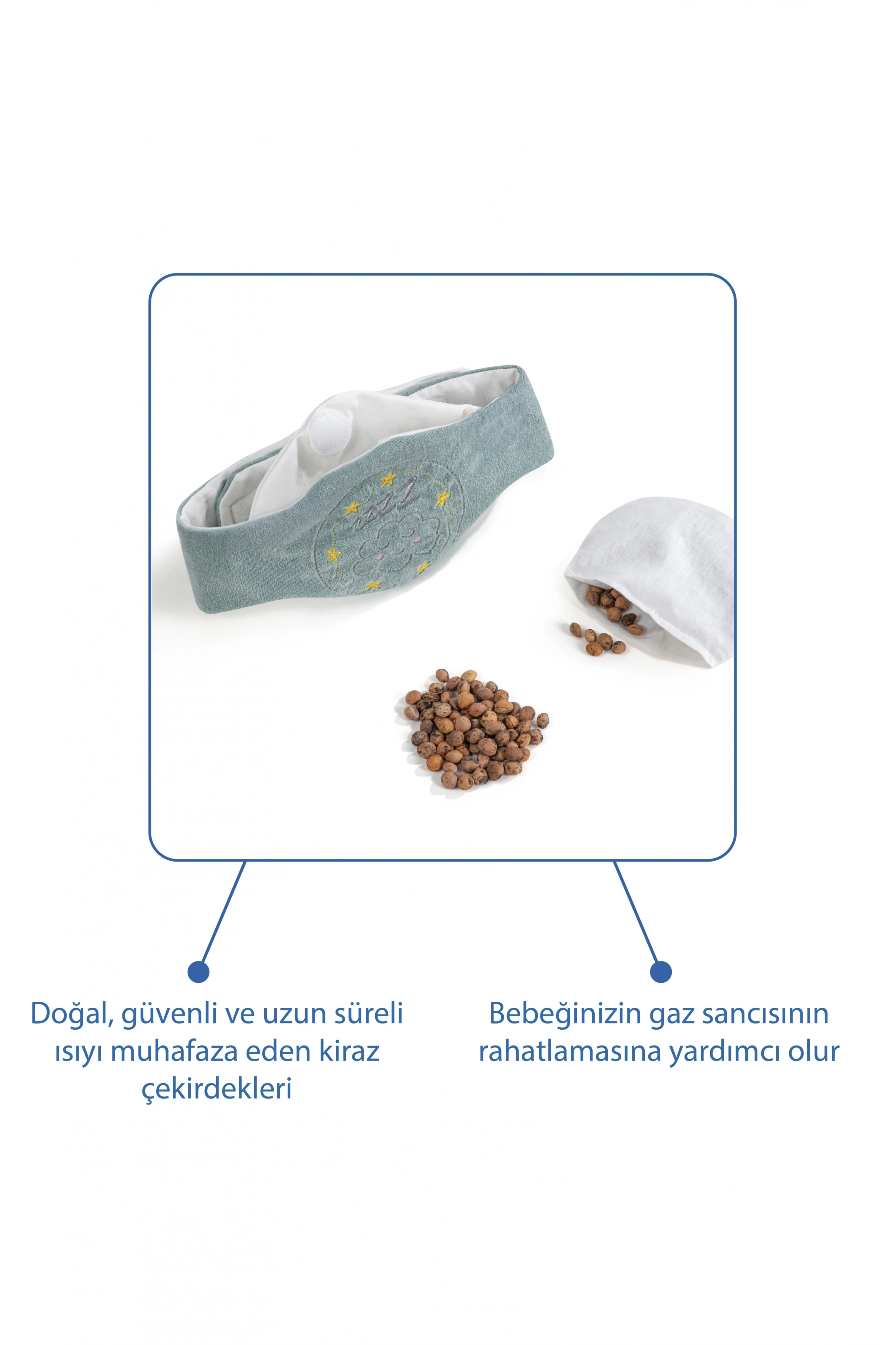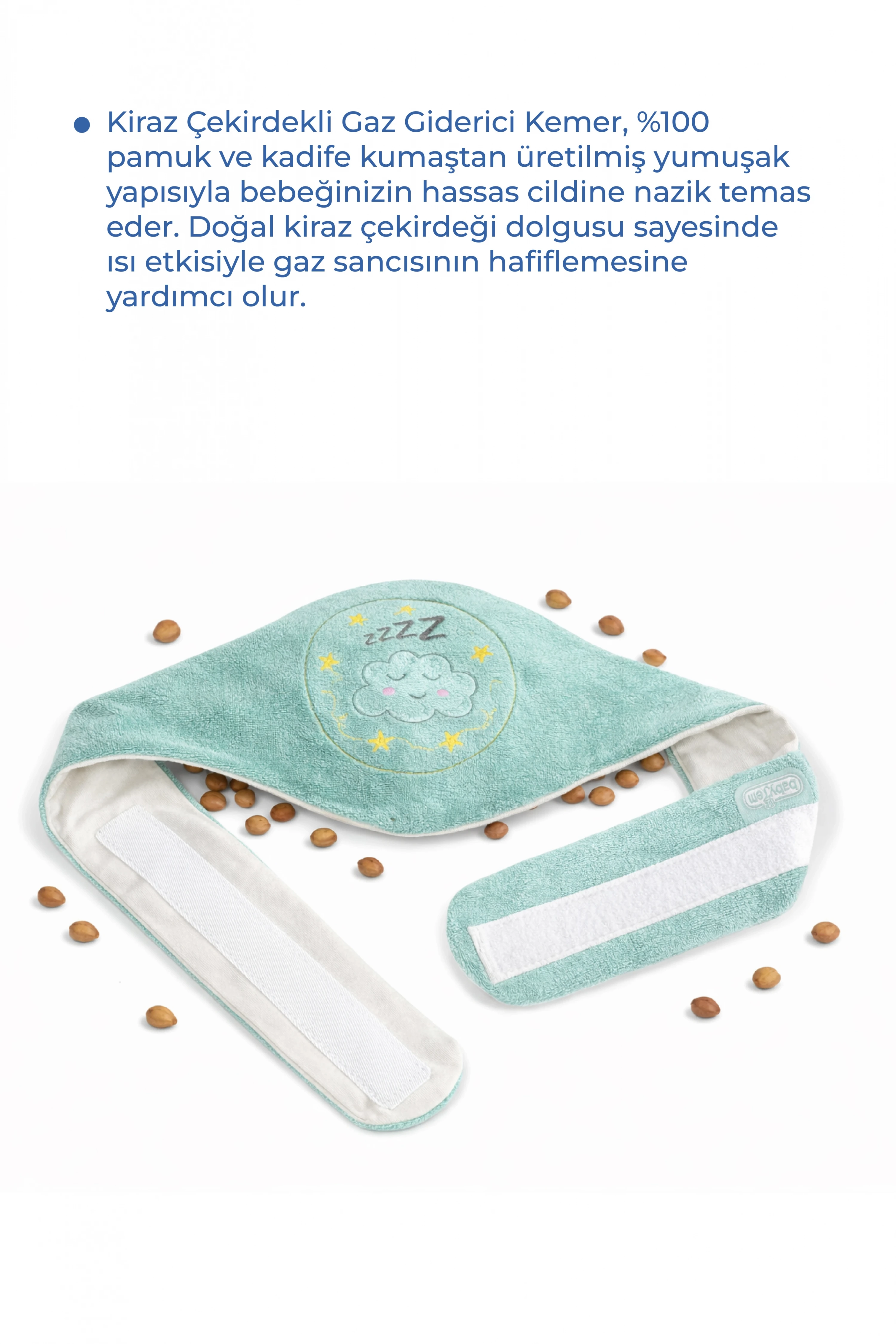 Babyjem Kiraz Çekirdekli Gaz Giderici Kemer Özellikleri; Bebekler için gaz sancısı hem aile hem bebek açısından büyük bir problemdir.; Babyjem kiraz çekirdekli gaz giderici kemer gaz sancısını azaltmak için %100 doğal malzemeden üretilmiş ideal bir üründür.; Kiraz çekirdekli kese 1 dakika ısıtılmalı ve kemerin cebine konularak bebeğin karnına gelecek şekilde bağlanmalıdır.; En iyi sonuç için bebeğinizin ısınmış karnına dairesel hareketlerle masaj yapınız.; %100 pamuk.