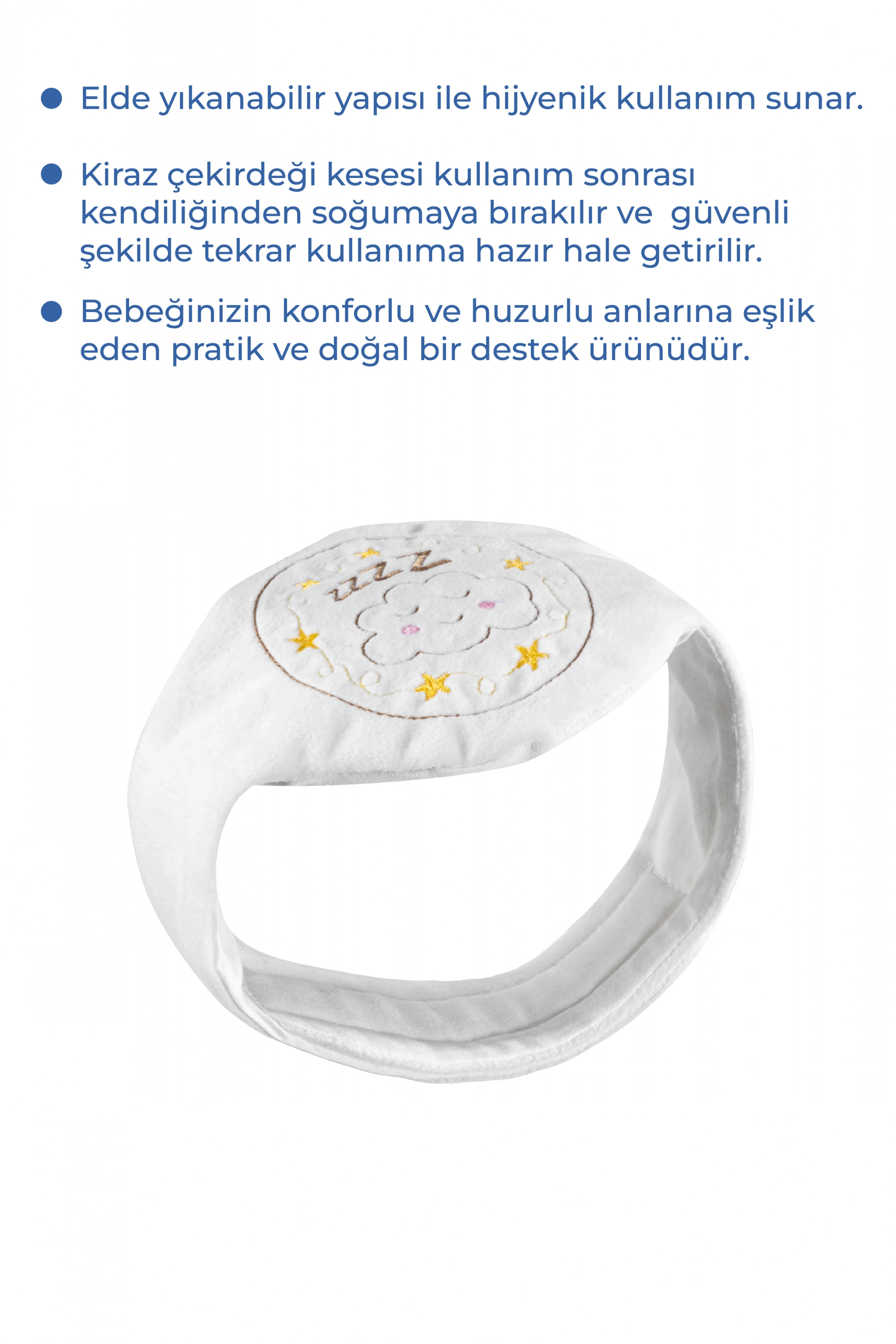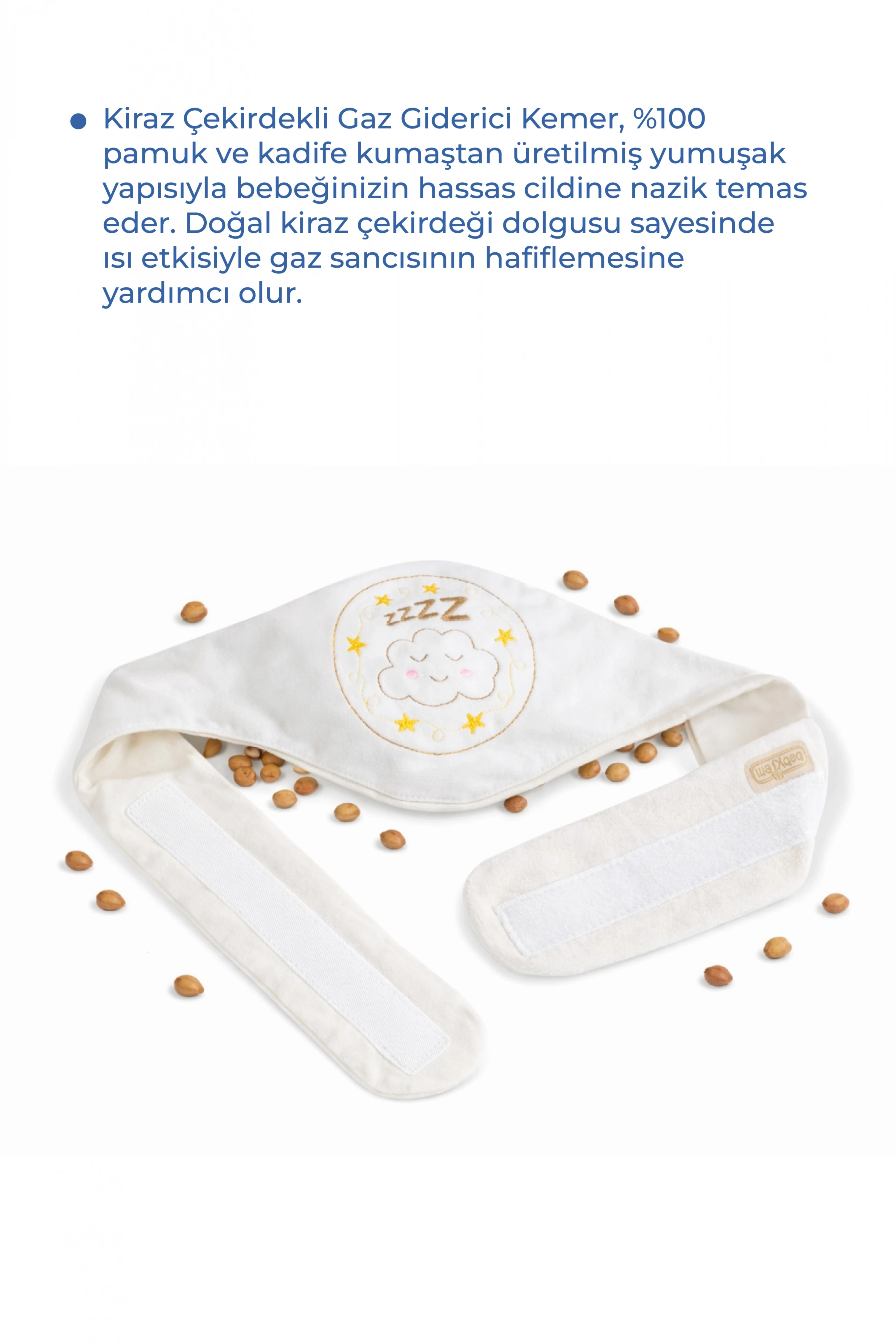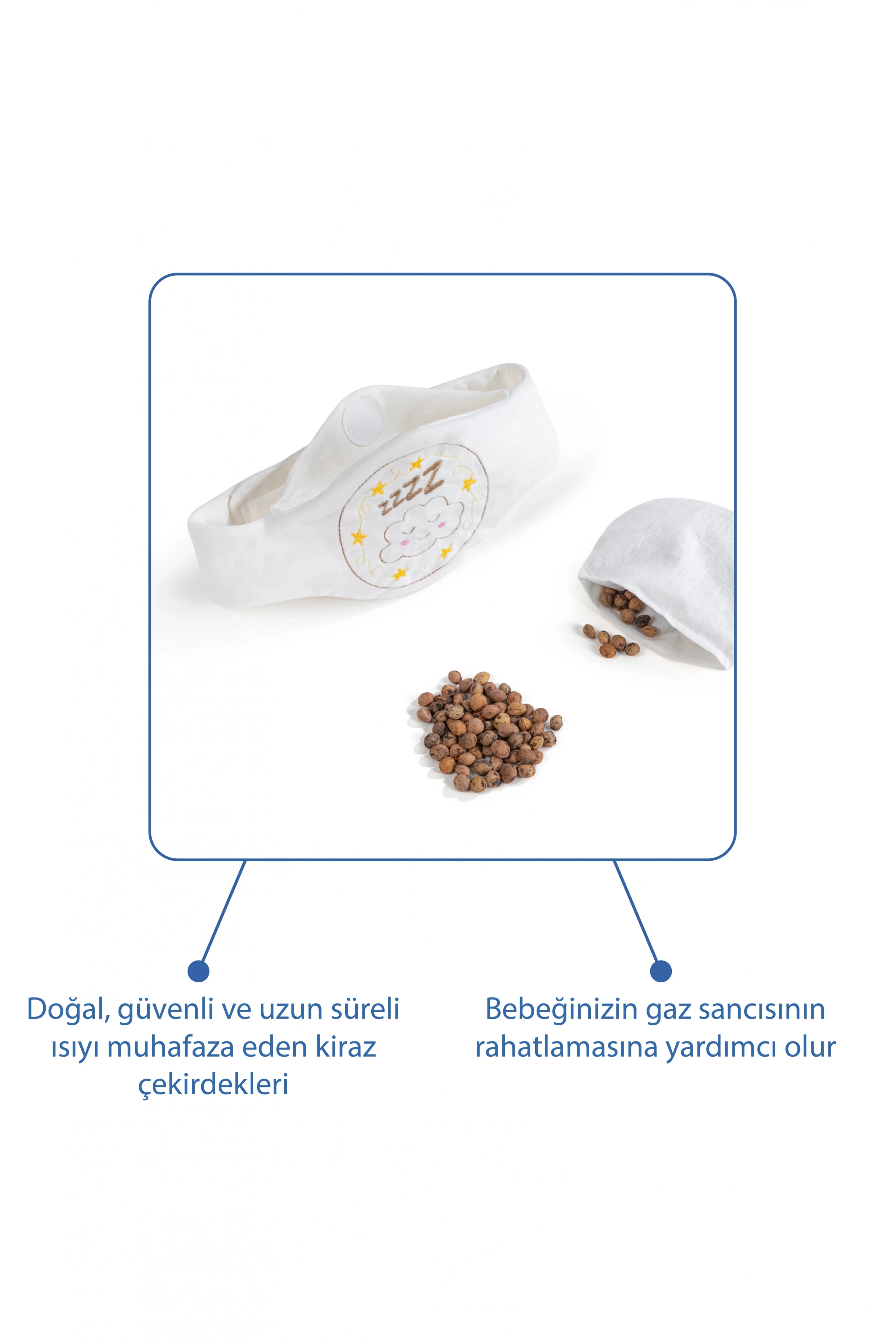 Kullanımı: Kiraz çekirdekli keseyi mikrodalga veya fırınınızın en düşük ayarında 1 dakika ısıtınız. Isıtılmış kiraz çekirdekli keseyi cebe koyup bebeğin karnına gelecek şekilde bağlayın. Isıyı uzun süre muhafaza edebilen kiraz çekirdeği, ısıyı yavaş yavaş dağıtarak bebeğinizin gaz sancısının giderilmesine yardımcı olur.