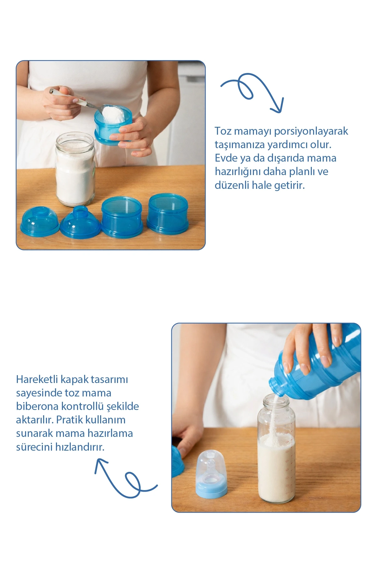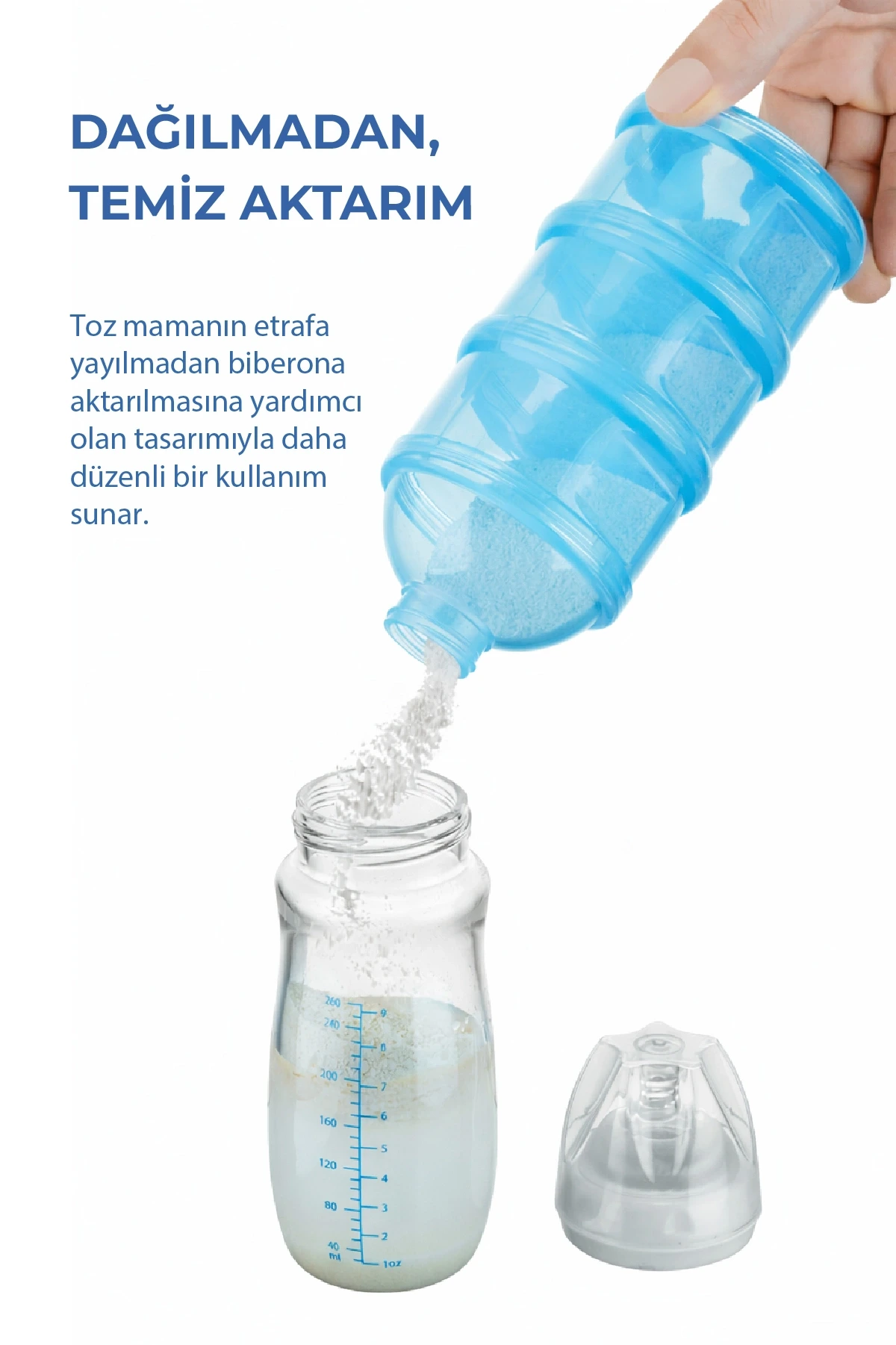 İçindeki toz mama kolayca biberona aktarılabilir