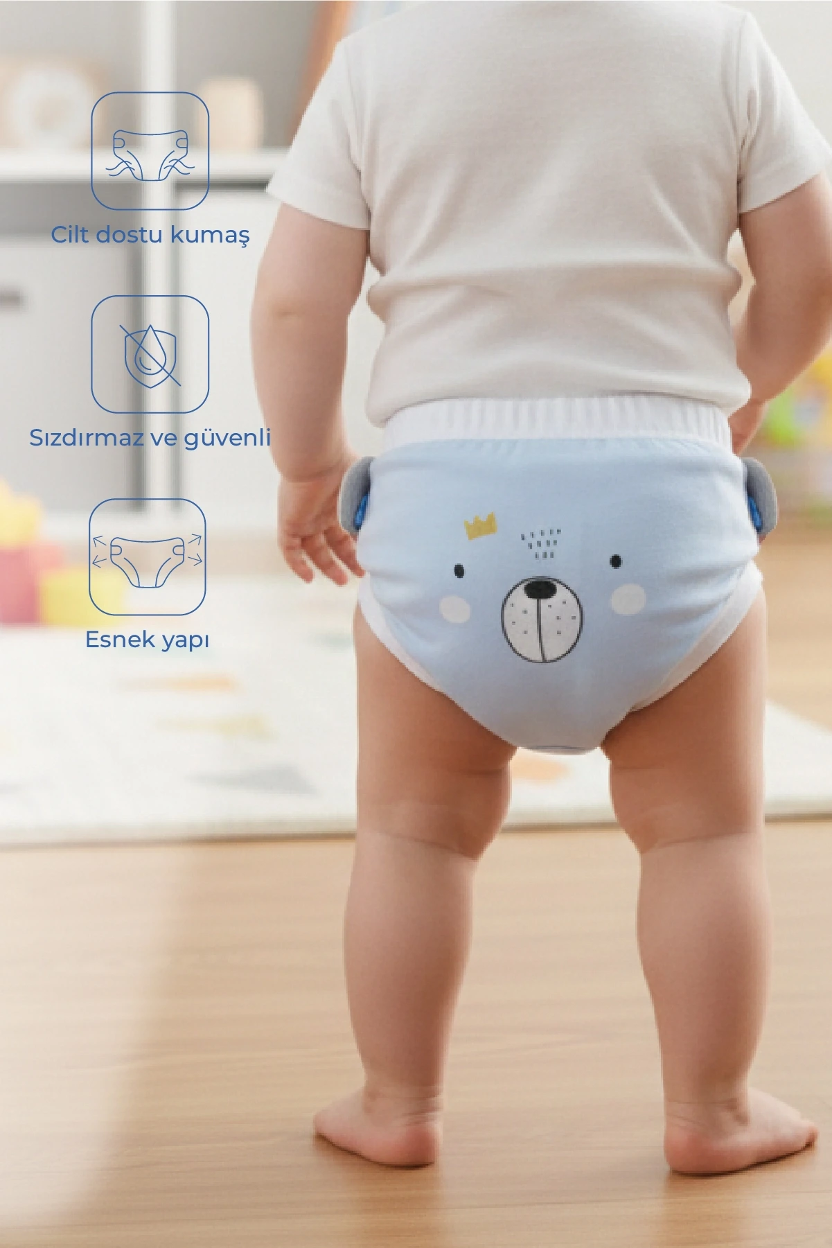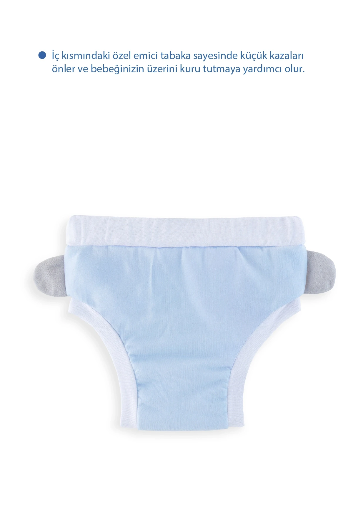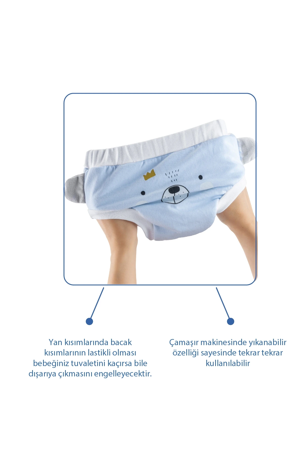 Yan kısımlarında bacak kısımlarının lastikli olması bebeğiniz tuvaletini kaçırsa bile dışarıya çıkmasını engelleyecek bebek bezi görevi görecektir. Çamaşır makinesinde yıkanabilir özelliğe sahiptir.